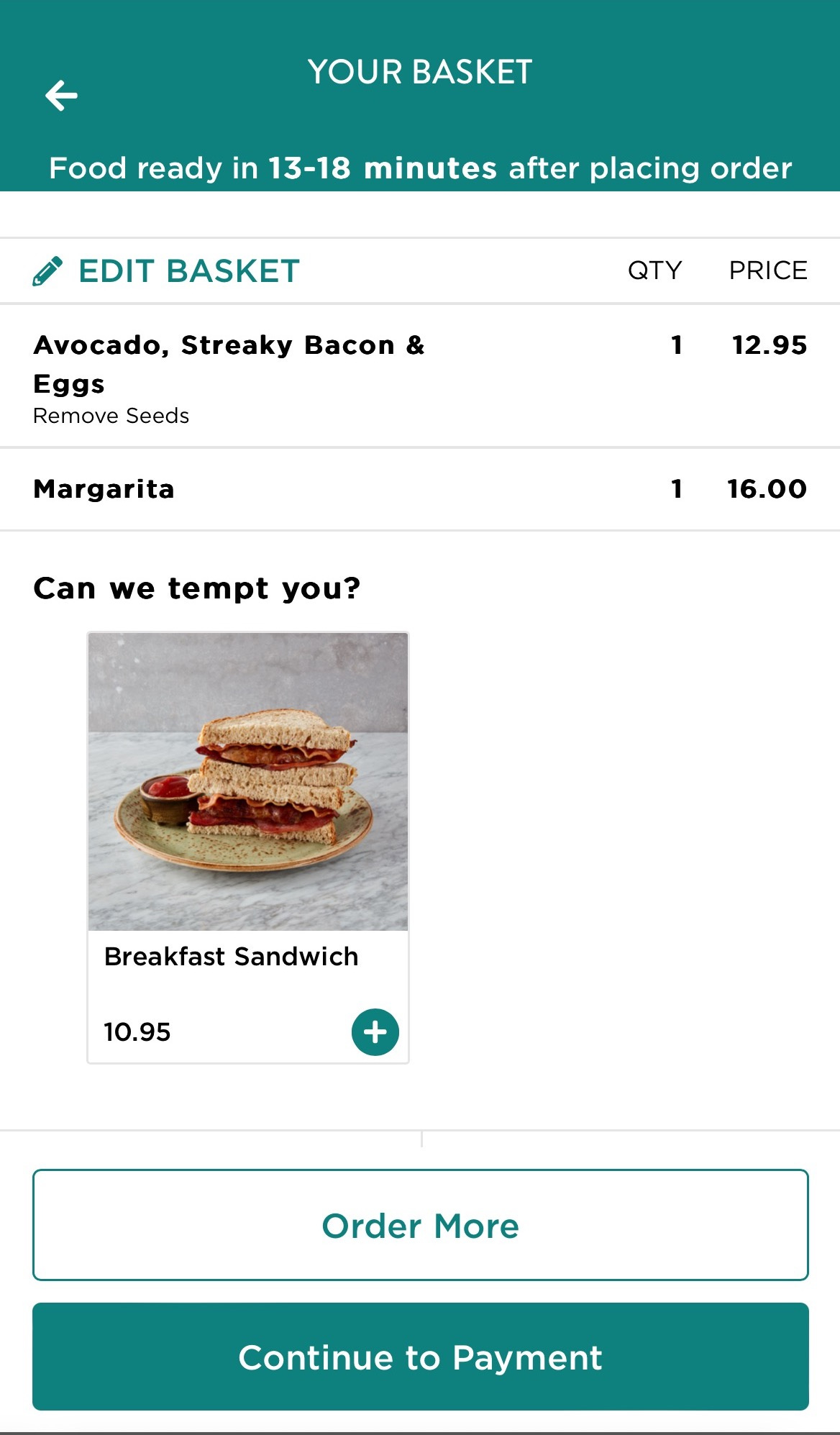 On one hand, the plus button I could press if I’m “Tempted” is an enticing cyan (would feel nice to press) but so is the biggest button on the screen, which is the straight forward “Continue to Payment” button, while the “Order More” option is de-emphasized.