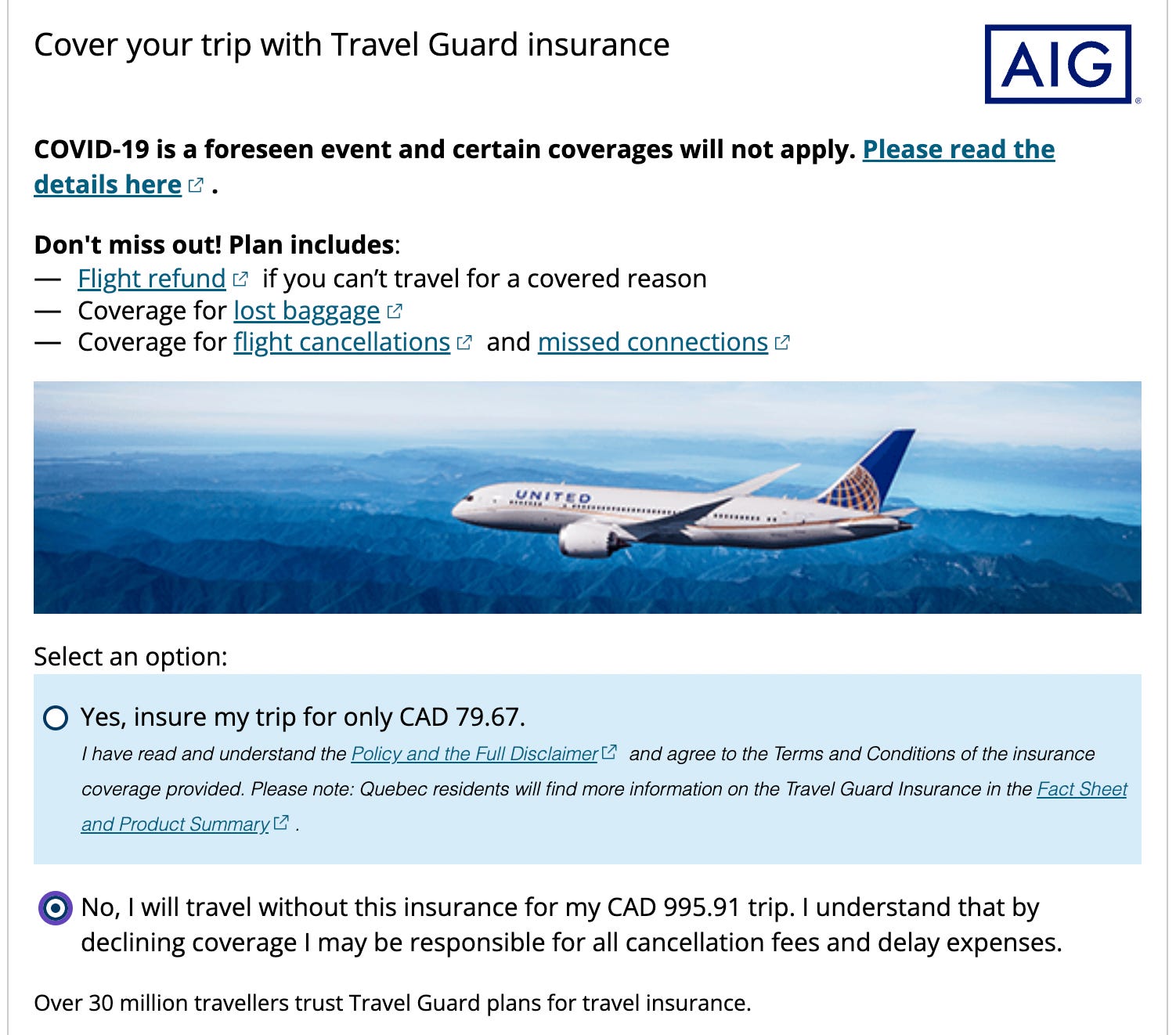 “No… I will travel without this insurance for my CAD 995.91 trip. I understand that by declining coverage I may be responsible for all cancellation fees and delay expenses.”
