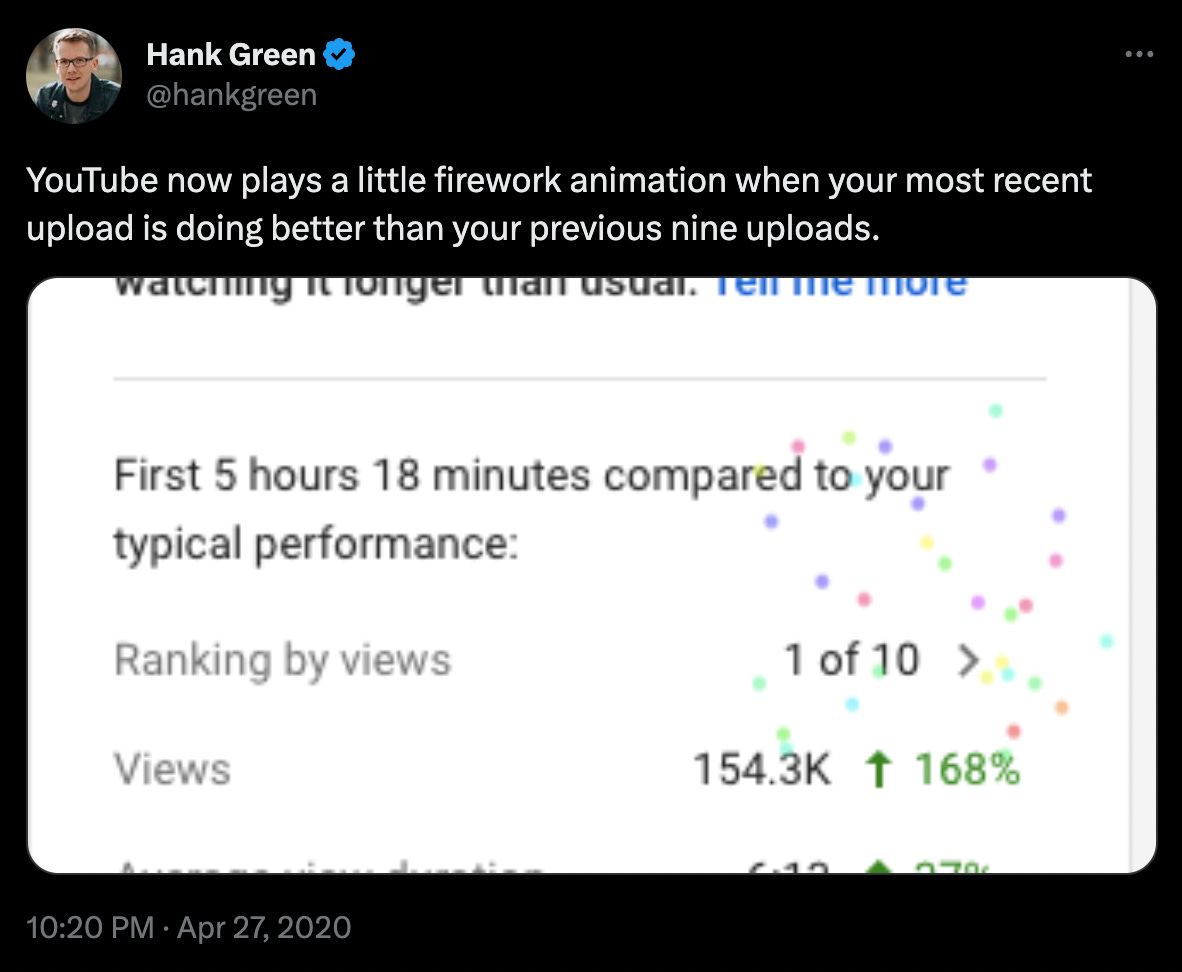 Content creators with superb analytics are valuable financial assets to YouTube. So the psychological stimulus they serve creators reflects this. When you have a poorly performing video, they want you to feel like you have failed in some essential, objective way. When your video is driving engagement, they reward you with literal confetti.