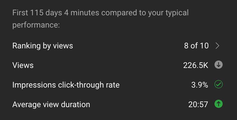 Perhaps the most infamous shock collar amongst these is the YouTube Creator dashboard. The “Latest Video Performance” summary is well known as a source of torment from tiny hobbyists all the way to well-established creators at the top of the ecosystem.